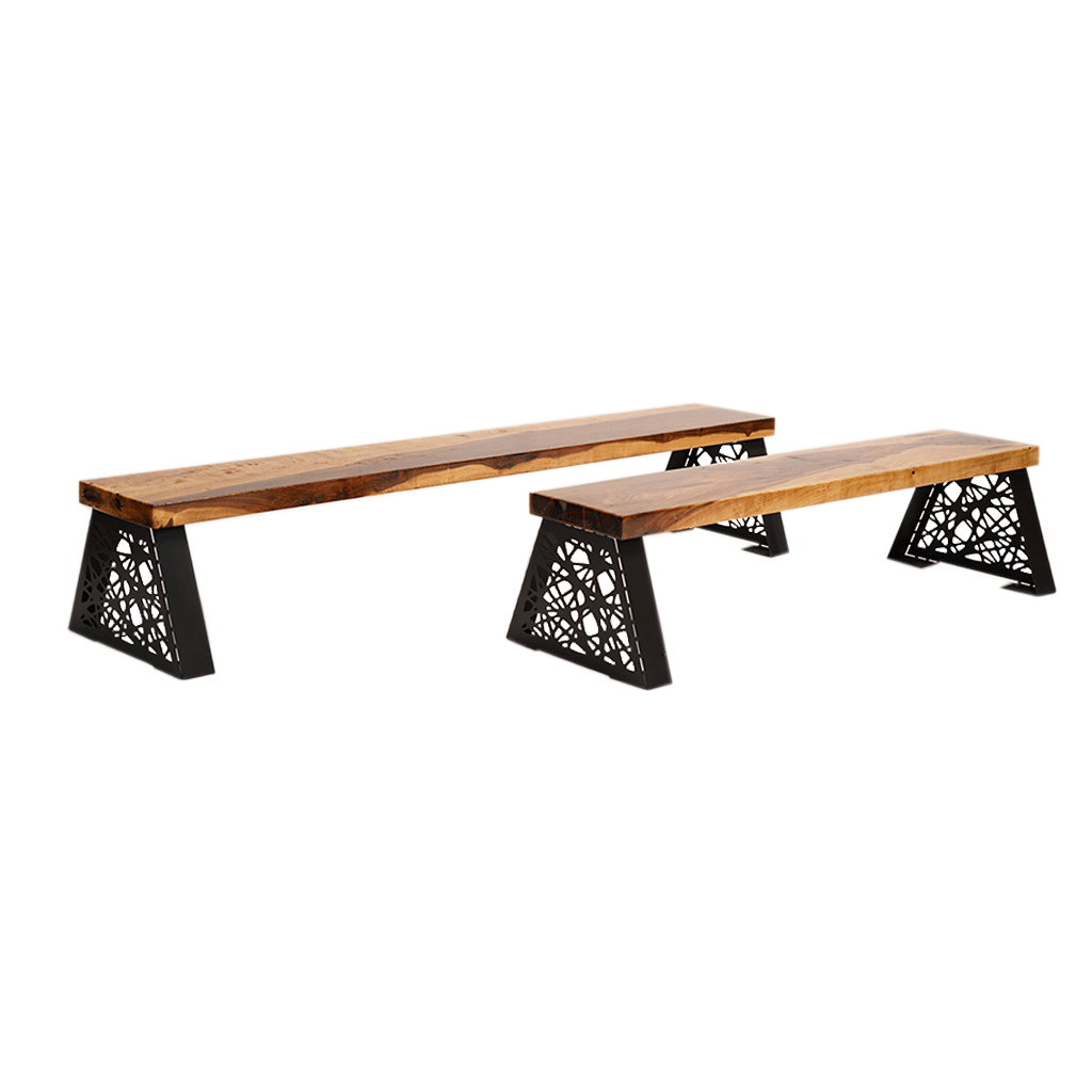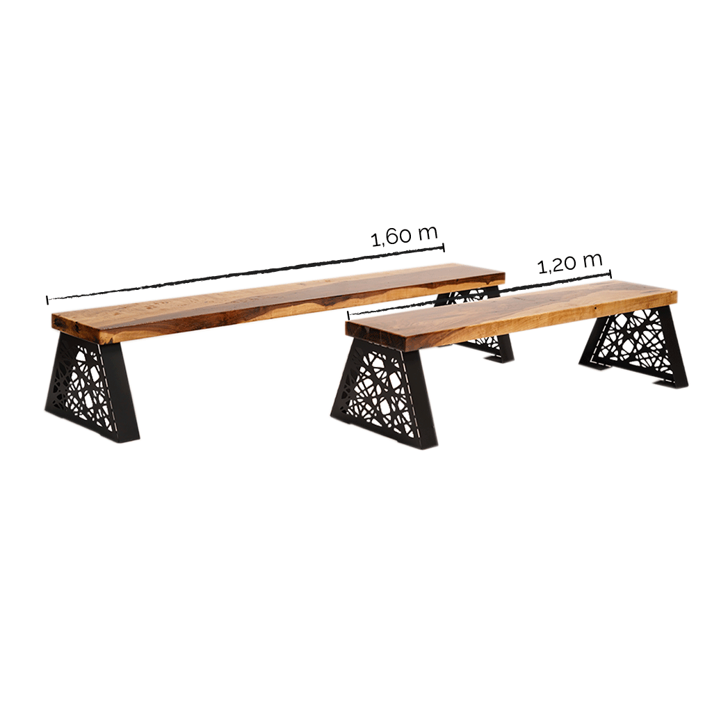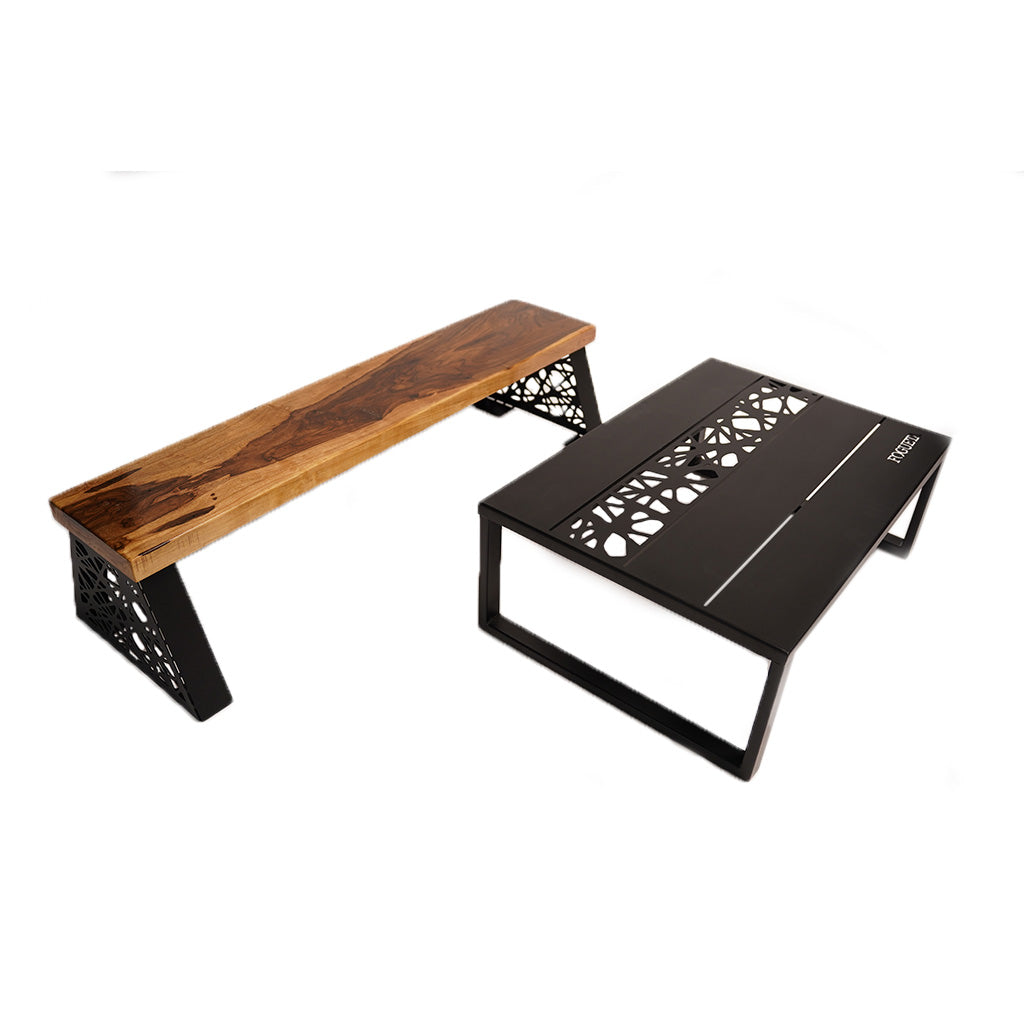 Nuestros bancos de madera brindan una posición de sentado baja con gran estilo de fogón para compartir asiento bien cerquita.