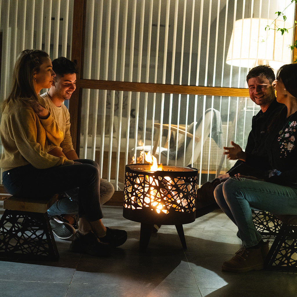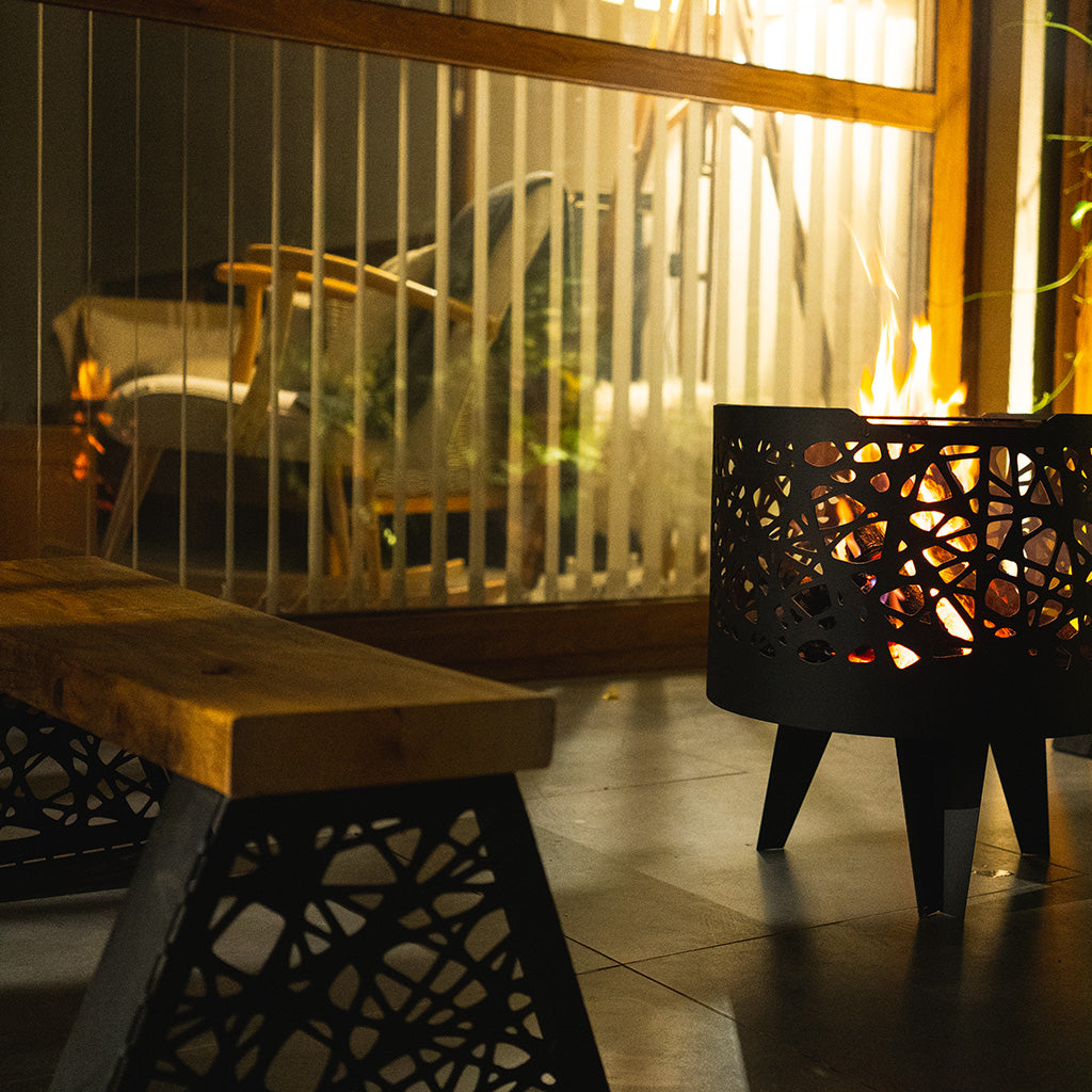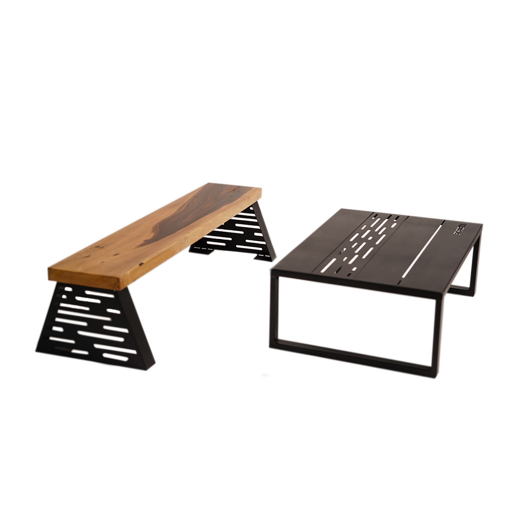 Nuestros bancos de madera brindan una posición de sentado baja con gran estilo de fogón para compartir asiento bien cerquita.