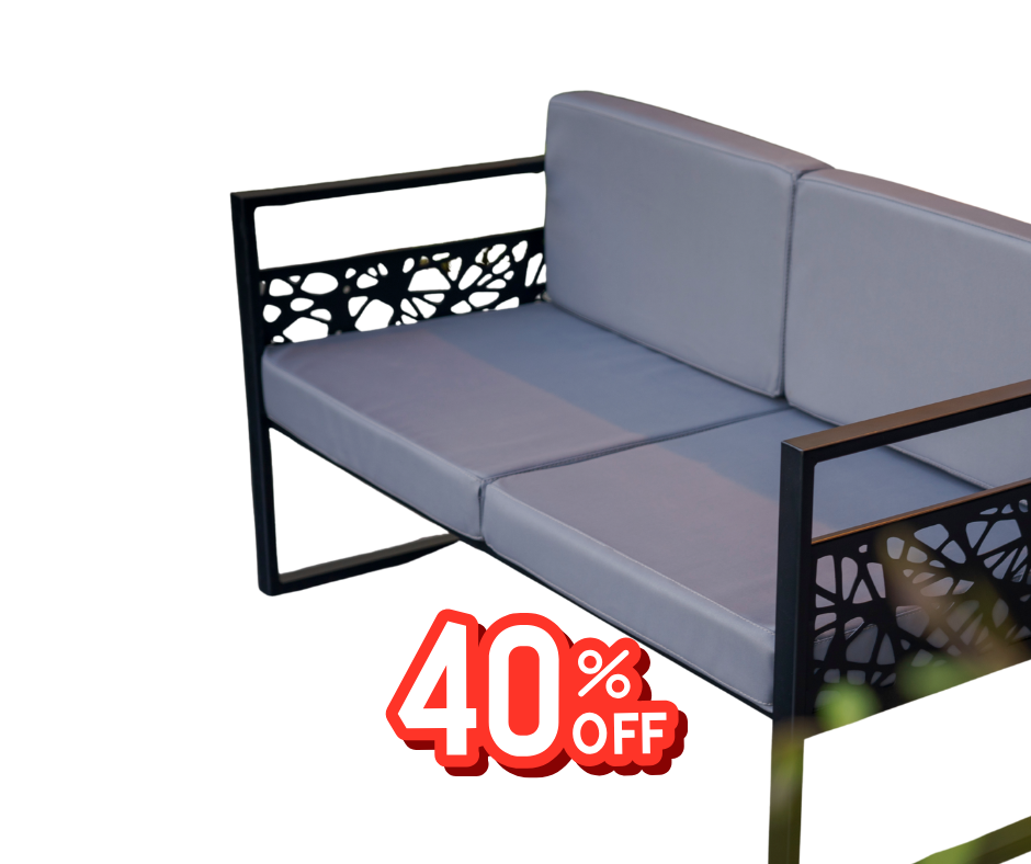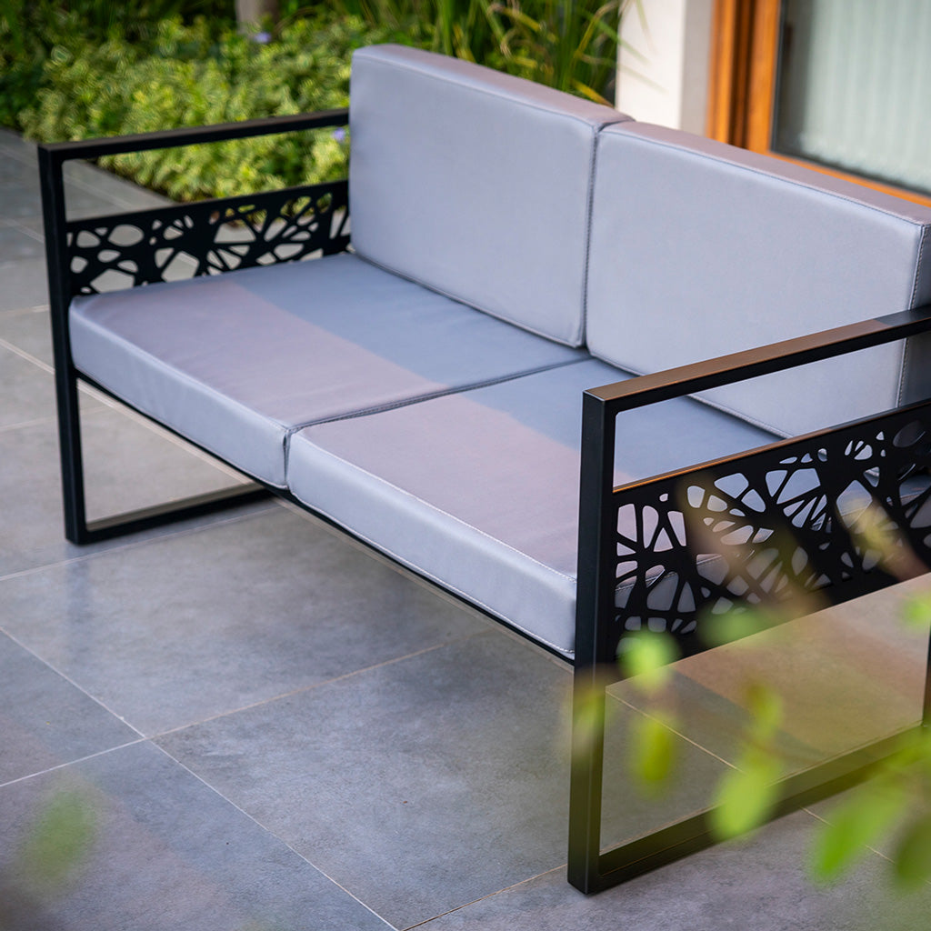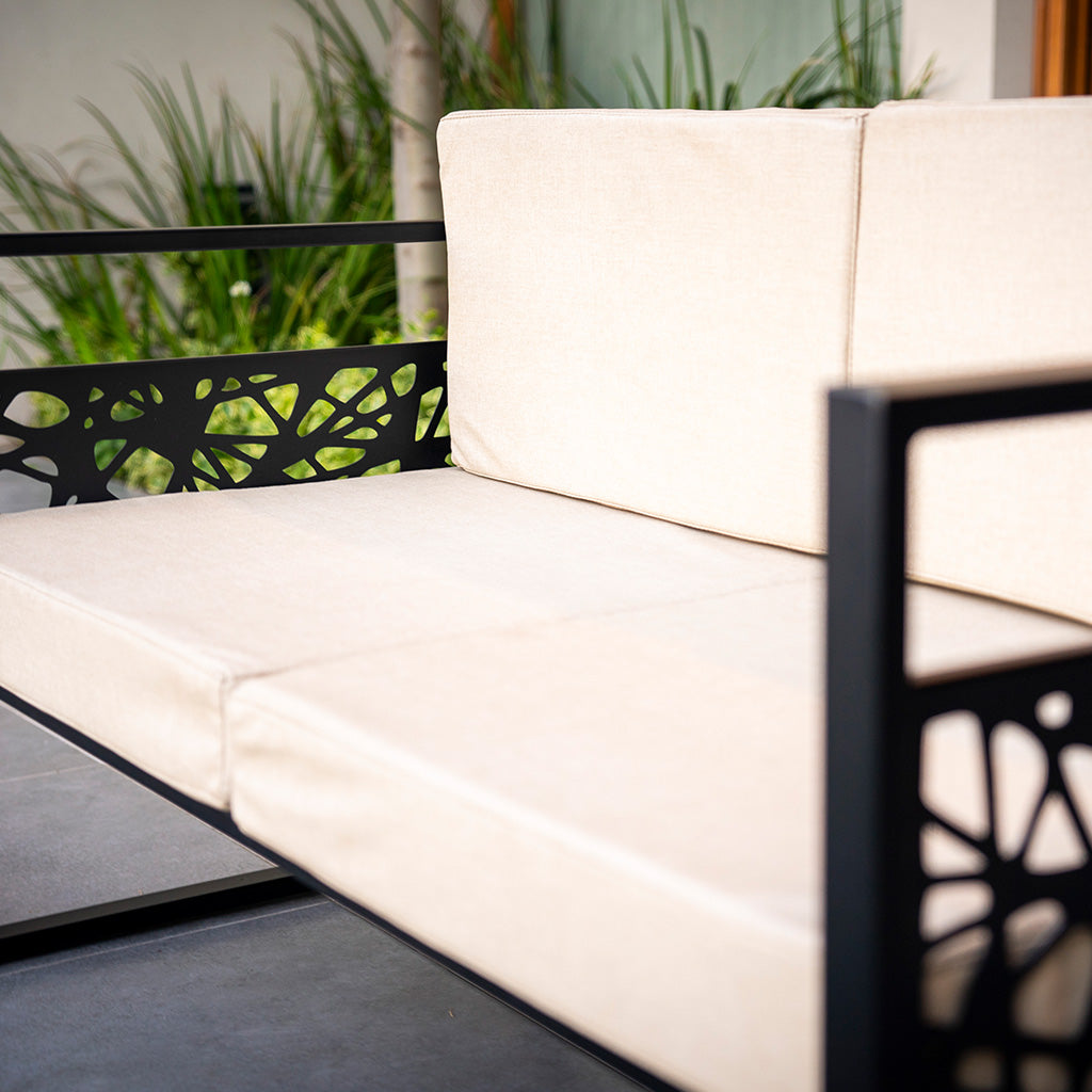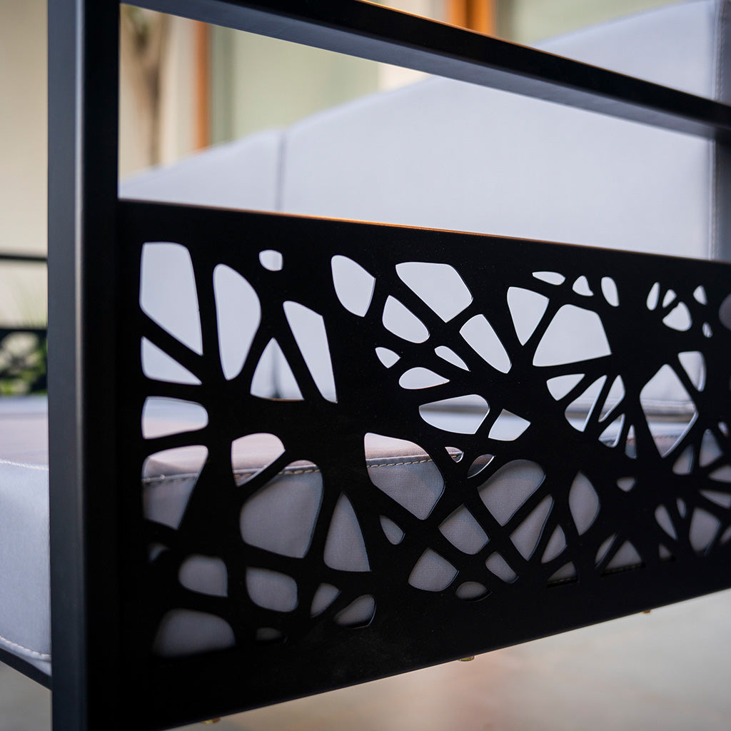 De líneas rectas y con el detalle de las tramas de la Fogueta, es ideal para ese espacio en el que quieras disfrutar una buena reunión, tanto al aire libre como bajo techo.